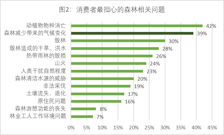 此次国际知名咨询顾问公司GlobalScan进行的全球消费者调研覆盖了15个国家的12,000名受访者1。报告显示,与2017年的调研结果相比,消费者对于气候变化问题的担忧明显加剧2。在最受关注全球性问题的调研中,气候变化问题位居第二。虽然人们对于气候变化的关注大幅提升昭示了该问题的严峻性和紧迫性,但消费者仍将疾病/健康问题视为头等大事。具体到森林相关问题,报告显示,人们最为关注的问题是由于毁林导致的气候变化以及动植物物种。