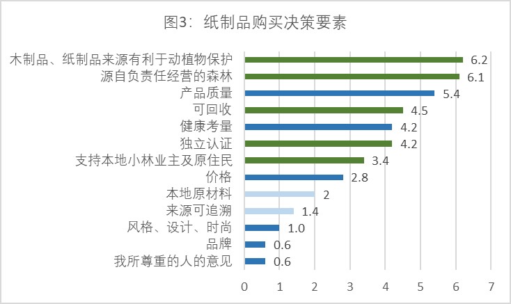 当被问及木制品的购买决策要素时,有益于动植物保护及源自可持续经营的森林名列前茅(几乎与产品质量同等重要);对于纸制品而言,这两项要素的重要程度甚至高于产品质量(更多信息见图3)。此外,消费者对自身潜在影响力的信心也在增强。